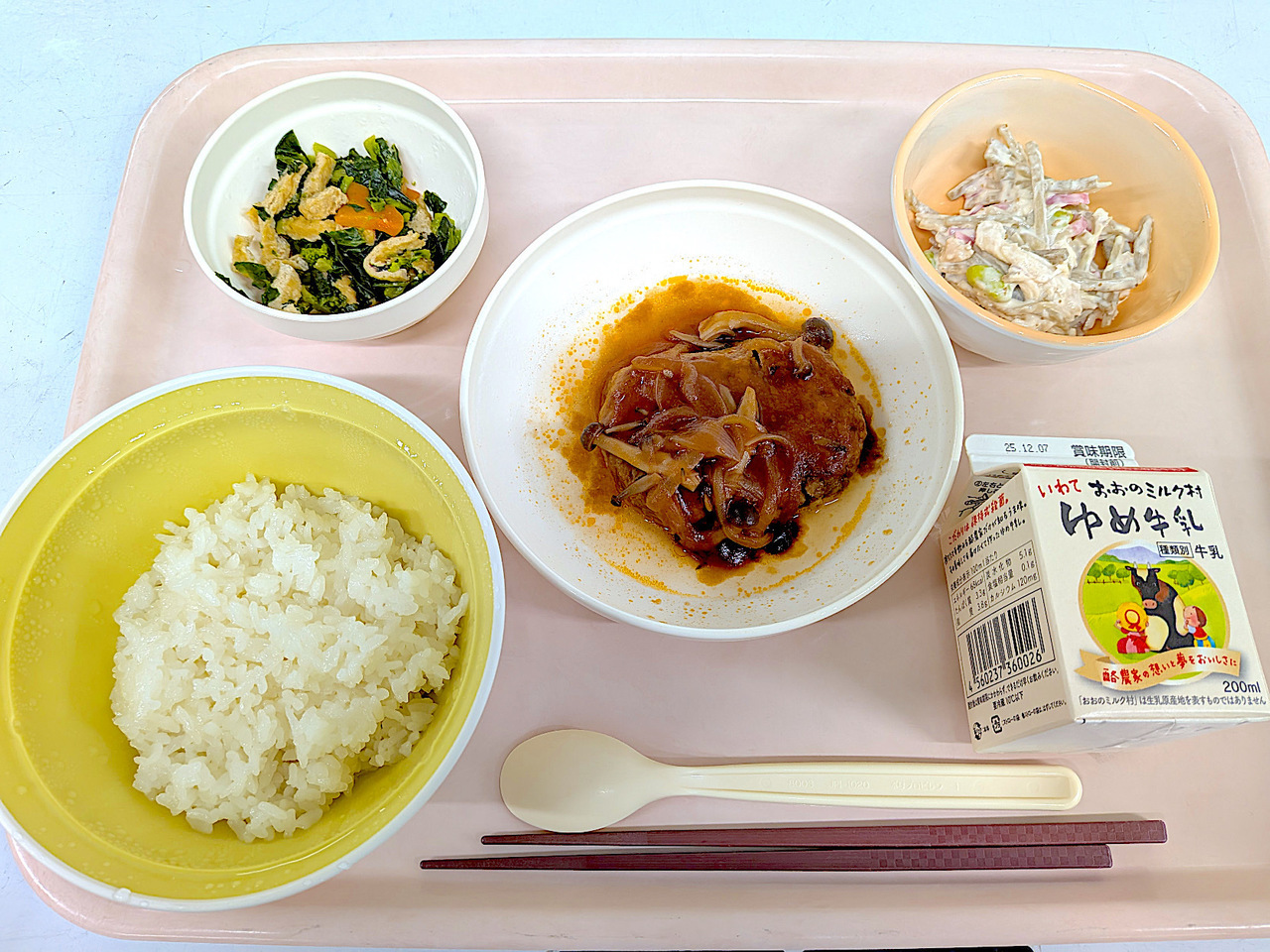 ハンバーグ、菜の花の炒め煮、ごぼうの胡麻サラダ
